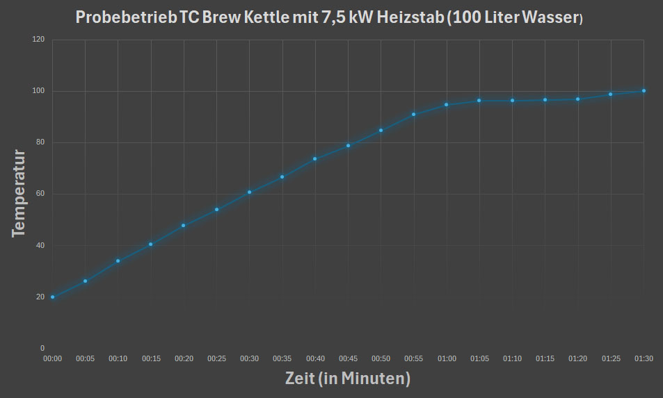 Nach etwa 45 Minuten brachte der TC Brew Kettle mit 7,5 kW-Heizstab 100 Liter Wasser zuverlässig auf die perfekte Anschwänztemperatur von 78 °C. Damit steht entspannten und effizienten Brautagen nichts mehr im Weg!
